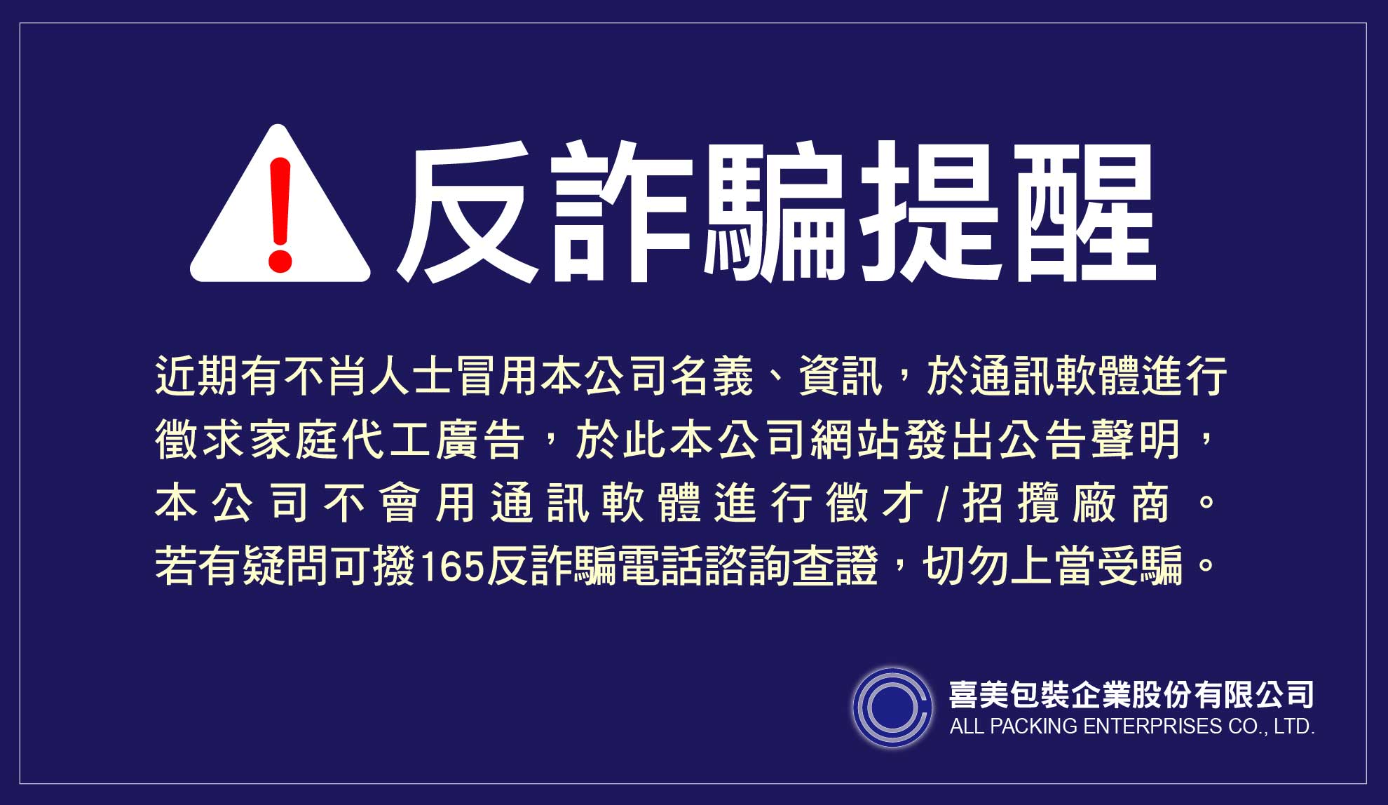 近期有不肖人士冒用本公司名義於網路上進行徵求家庭代工廣告 首頁 最新消息 近期有不肖人士冒用本公司名義於網路上進行徵求家庭代工廣告 近期有不肖人士冒用本公司名義及資訊,於通訊軟體進行徵求家庭代工廣告,於此本公司網站發出公告聲明,本公司不會用通訊軟體進行徵才/招攬廠商。若有疑問可撥165反詐騙電話諮詢查證,切勿上當受騙。本公司將保留法律追訴權。