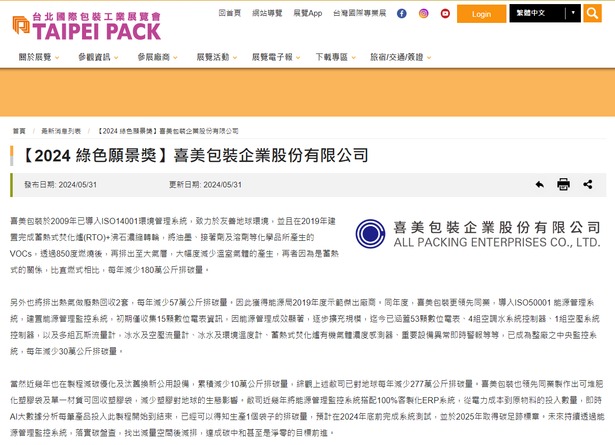 台北國際食品加工機械展臺灣國際生技製藥設備展台北國際包裝工業展台灣國際飯店暨餐飲設備用品展很榮幸在2024年首次推出Green Vision Award,以表彰於環境保護、社會責任和公司治理方面做出卓越貢獻的參展商。透過此獎項,鼓勵所有參展企業將ESG理念融入日常運營之中,共同推動食品產業的綠色轉型和永續發展。