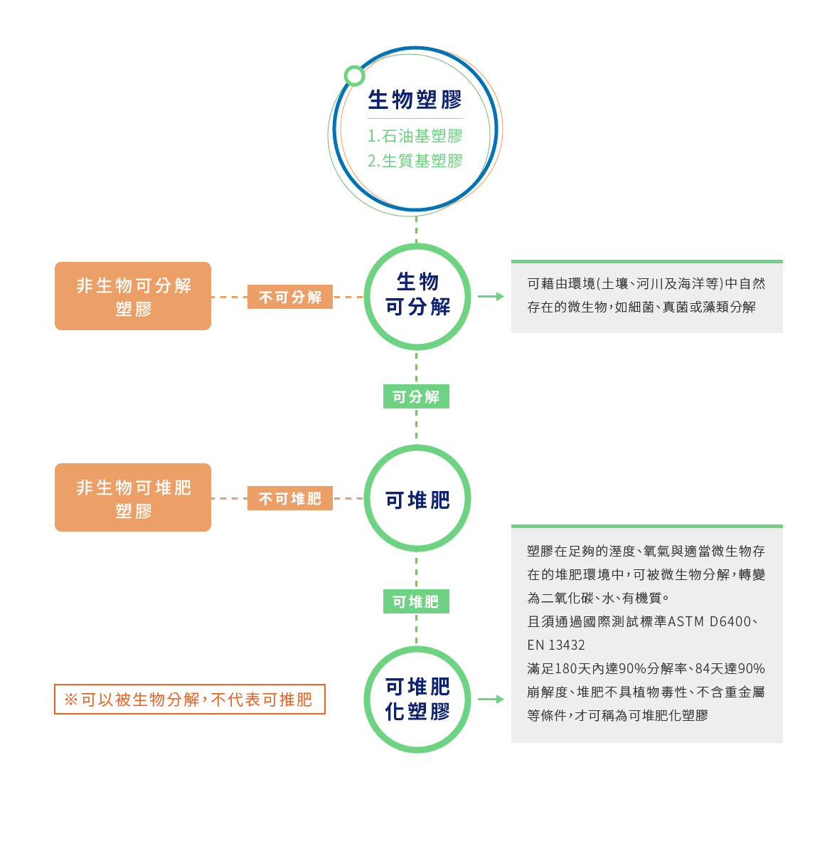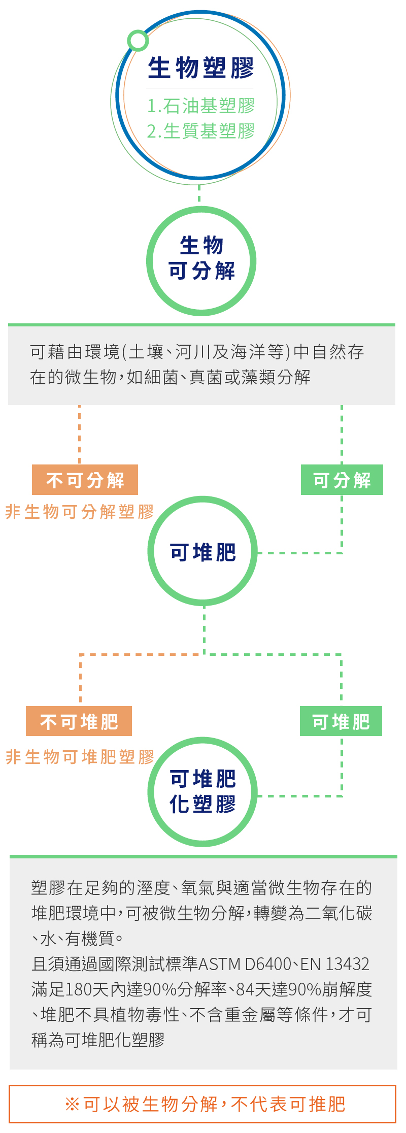 - 生分解塑膠:經微生物分解後可再度回歸自然者,又稱為生物可分解塑膠。